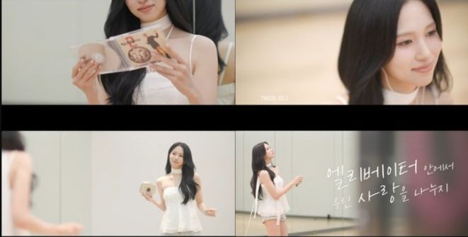 영상 속 미나는 연습실 한편에 앉아 쉬던 중 박진영의 음반을 CD플레이어로 재생했다. 이어 박진영의 '엘리베이터' 음원 일부가 흘러나왔고, 미나는 자연스럽게 리듬을 타기 시작했다. 흥이 오른 미나는 자리에서 일어나 자신만의 그루브를 보여주며 보는 이들에게 기분 좋은 설렘을 안겼다.