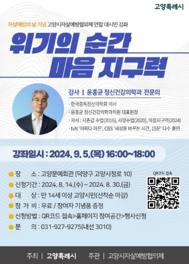고양시자살예방협의체 연합 대시민 강좌는 만 14세 이상 고양시민이면 누구나 참여할 수 있다. 고양시자살예방센터 누리집 배너 및 큐알(QR)코드 접속을 통해 8월 30일까지 선착순으로 신청 가능하며, 참여자 전원에게 소정의 상품을 제공할 예정이다.