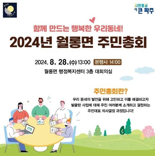 주민총회는 월롱면 주민들과 함께 발굴한 2025년 자치계획형 사업에 대해 주민들에게 발표하고 의결하는 ‘직접민주주의의 장’으로, 월롱면 주민이면 누구나 참여할 수 있다.