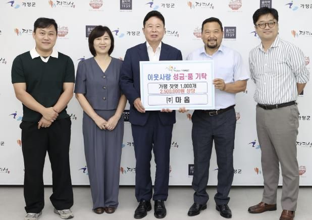 (중부시사신문) 가평군은 최근 ㈜마음에서 가평군청을 방문해 이웃돕기 성품으로 250만원 상당의 잣엿을 기탁했다고 밝혔다.