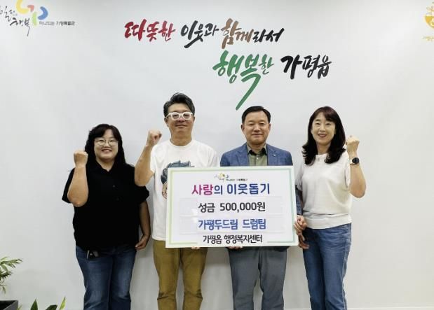 (중부시사신문) 가평읍 주민자치프로그램 드럼 강좌반인 가평두드림 드럼팀은 최근 가평읍 행정복지센터를 방문해 성금 50만원을 기탁했다.