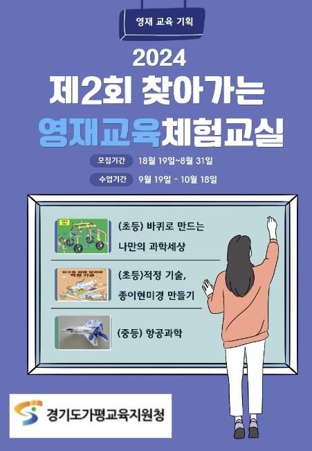 (중부시사신문) 가평교육지원청은 가평 지역이 넓고 지리적 요인으로 인하여 학생들이 영재교육에 참여하지 못하는 상황에서 초등학생(4~6학년), 중학생(1~3학년)들에게 영재교육 기회를 제공하기 위해 작년에 이어 2024년 제2회"찾아가는 영재교육체험교실"프로그램을 운영한다고 말했다. 제2회"찾아가는 영재교육체험교실"프로그램은 8월 19일 ~ 8월 30일까지 신청을 받아 9월 19일 ~ 10월 18일까지 운영될 예정이다.