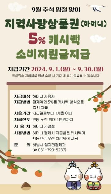 (중부시사신문) 하남시는 추석 명절 소비 촉진을 위해 오는 9월 1일부터 예산 소진 시까지 하남시 지역사랑상품권인 ‘하머니’ 결제 금액의 5%를 캐시백 형태의 소비지원금으로 선착순 지급하는 이벤트를 진행한다.