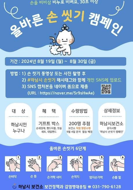 이벤트 참여 희망자는 이달 19일부터 30일까지 손 씻기 동영상 또는 사진을 촬영해 '#하남시 손 씻기' 해시태그와 함께 개인 SNS에 업로드한 후 SNS 캡처본을 네이버 폼에 제출하면 된다.