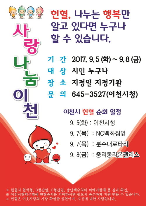 이천시는 “헌혈, 나누는 행복만 알고 있다면 누구나 할 수 있습니다”라는 주제로 2017년 하반기 사랑 나눔 헌혈운동을 9월 5일부터 8일까지 실시한다고 29일 밝혔다. 참여 목표 인원은 1천 명이다.