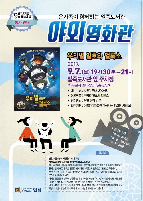안성시립일죽도서관은 오는 9월 7일 목요일 저녁 7시 30분(81분상영) 일죽도서관 주차장에서 시민들을 위한 야외영화상영(상영작:우리별 일호와 얼룩소)을 한다고 밝혔다. 이날 행사는 독서의 달을 맞이하여 한국영상자료원에서 운영하는 찾아가는 영화관 서비스를 일죽도서관이 신청해 마련되었다.
