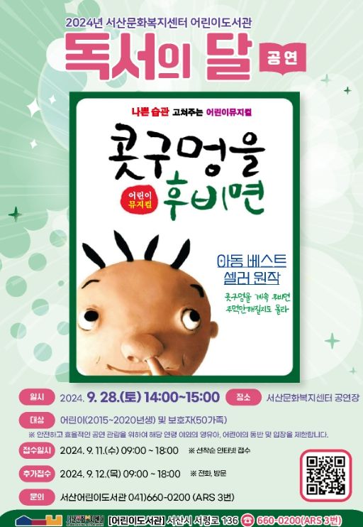 (중부시사신문) 서산문화복지센터 어린이도서관은 9월 독서의 달을 맞아 어린이뮤지컬 ‘콧구멍을 후비면’ 공연을 2024년 9월 28일 서산문화복지센터 공연장에서 무료로 진행할 예정이다.