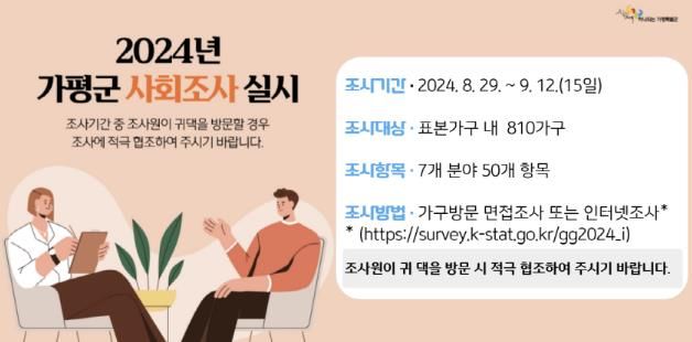 (중부시사신문) 가평군은 8월 29일부터 9월 12일까지 경기도와 공동으로 ‘2024년도 가평군 사회 조사’를 실시한다며 적극적인 협조를 당부했다.