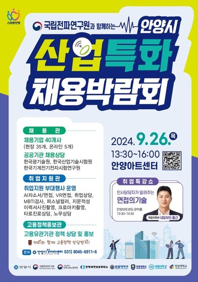 (중부시사신문) 안양시는 국립전파연구원과 함께 ‘산업특화 채용 박람회’를 오는 9월 26일 오후 1시 30분 안양아트센터에서 개최한다고 1일 밝혔다.