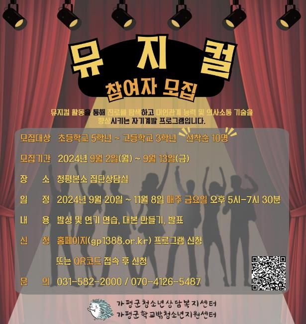 (중부시사신문) 가평군청소년상담복지센터는 가평지역 청소년의 자기 계발 사업의 일환으로 2024년 하반기 뮤지컬 프로그램을 운영한다고 밝혔다.