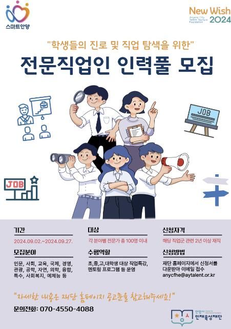 (중부시사신문) 안양시 인재육성재단은 9월 2일부터 27일까지 지역 학생들의 진로탐색을 지원하고, 다양한 직업 세계 경험 제공을 위한 전문직업인 인력풀을 모집한다고 4일 밝혔다.