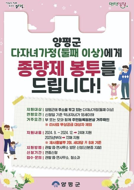 올해는 9월분부터 12월분까지 연중 신청을 통해 종량제봉투 24매를 지급하며, 2025년부터는 연중 신청 및 연 1회 72매 지급으로 더욱 주민 편의를 높인다.