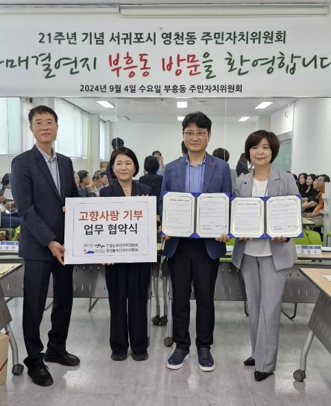작년 6월 자매교류 20주년을 맞아 부흥동 주민자치위원회는 2박 3일의 일정으로 서귀포시 영천동을 방문했고, 상호 간 고향사랑기부제 동참에 대한 공감대가 형성됨에 따라 올해 협약 체결이 성사됐다.