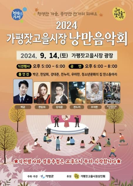 (중부시사신문) 추석 대명절을 앞두고 ‘2024년 가평잣고을시장 낭만음악회’가 14일 가평잣고을광장에서 개최된다.