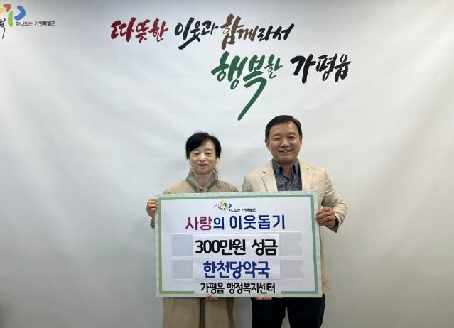 (중부시사신문) 가평군 가평읍 한천당약국은 5일 가평읍 행정복지센터를 방문해 사랑의 이웃돕기 성금 300만원을 전달했다. 지난 1월에도 가평읍에 300만원의 성금을 기탁한 한천당약국이 민족의 대명절인 추석을 맞아 추가로 성금을 기탁한 것이다.