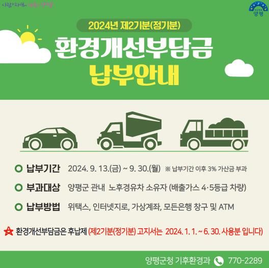 (중부시사신문) 양평군은 2012년 7월 이전에 출고된 노후 경유 자동차(배출가스 4‧5등급) 4,442대에 대해 2024년 2기분 환경개선부담금 1억 4,390만 원을 부과한다고 9일 밝혔다.