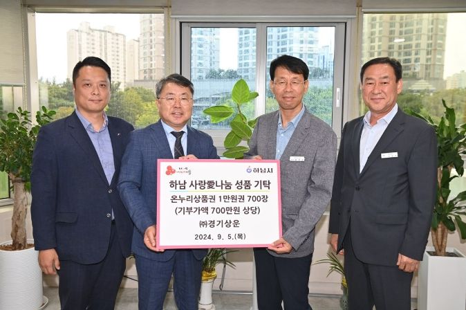 ㈜경기상운 허덕행 상무이사는 “민족 최대 명절 추석을 앞두고 하남시 어려운 이웃들을 위해 온누리상품권을 기탁할 수 있게 되어 감사한 마음이며, 우리의 작은 정성이 소외된 이웃들에게 조금이나마 도움이 됐으면 좋겠다”며 기탁 소감을 밝혔다.