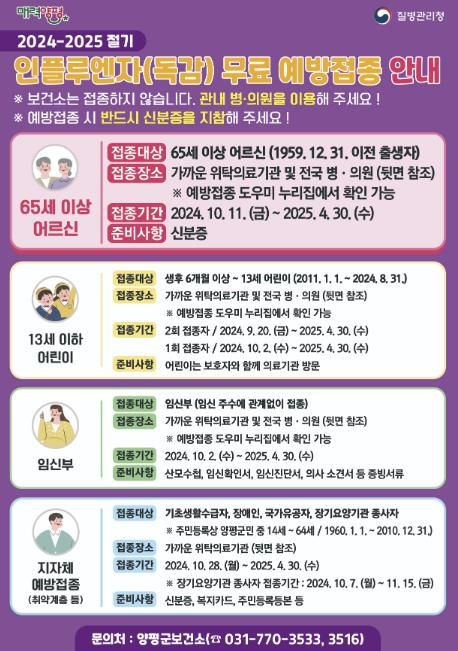 또한, 양평군은 지자체 사업으로 14 ~ 64세(1960.1.1.~2010.12.31.출생자), 기초생활수급자 ‧ 국가유공자 · 장애인 · 다문화가정을 대상으로 독감 무료접종을 실시하며, 올해는 도비 지원으로 장기요양기관 종사자에 대한 무료접종도 가능하게 됐다.