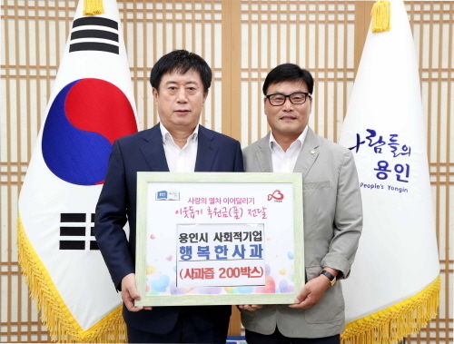 용인시는 추석명절을 앞두고 지난 15일 관내 사회적기업인 ‘행복한사과’에서 어려운 이웃을 위해 써달라며 정찬민 시장을 찾아 사과즙 200박스를 기탁했다고 밝혔다.