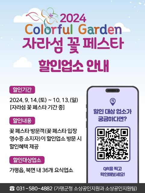 (중부시사신문) 가평군 소상공인연합회는 9월 14일부터 10월 13일까지 열리는 ‘2024 자라섬 꽃 페스타(가을)’와 연계해 할인 이벤트를 제공할 참여업소 36곳을 선정했다고 12일 밝혔다.