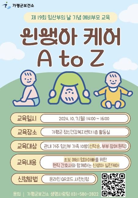 오는 10월 7일 오후 2시부터 4시까지 가평군 정신건강복지센터 1층 활동실에서 진행되는 이번 출산 교실은 ‘현직 간호사와 함께하는 신생아 실전케어’를 주제로 아직 신생아 육아가 막막한 예비부모들에게 유익한 정보를 제공할 예정이다. 또한, 예비부모 교육에 참여하는 모든 예비부부에게 기념선물이 증정된다.