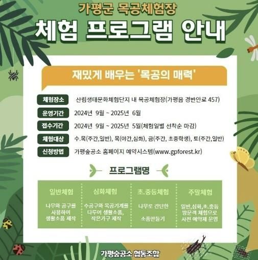 이우인 가평숲공소 협동조합 이사장는 “가평숲공소 목공체험 프로그램을 통해 친환경 재료인 목재에 친숙해지는 기회를 제공하고자 한다”며 “프로그램 참여자들의 안전에 각별히 유의해 내실 있는 목공프로그램을 운영하겠다”고 말했다.