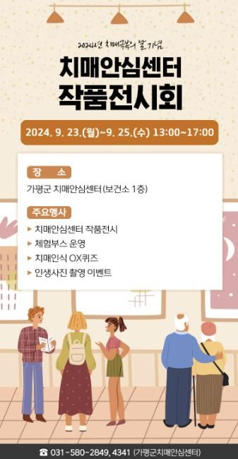 전시회는 23일부터 25일까지 가평군보건소 1층 치매안심센터에서 진행되며, 오후 1시에서 5시 사이에 관람이 가능하다.