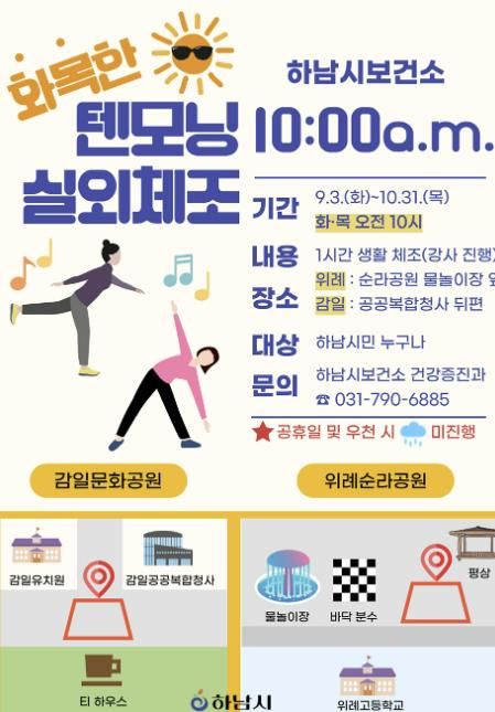 ‘실외체조 텐모닝’은 매주 화·목요일(공휴일 및 우천 시 미운영) 오전 10시부터 11시까지 감일문화공원과 위례순라공원에서 실외체조를 배울 수 있는 건강 증진 프로그램이다.