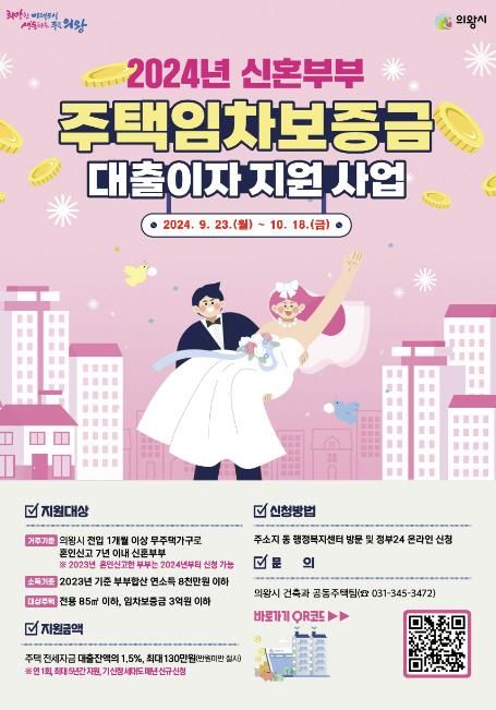 지원 자격은 공고일 기준(2024년 9월 11일) △의왕시 전입 1개월 이상 무주택가구로, 혼인신고 7년 이내 △2023년 기준 부부합산 연소득 8000만 원 이하 △의왕시 소재 주택(전용면적 85㎡이하, 임차보증금 3억 원 이하)이어야 한다.