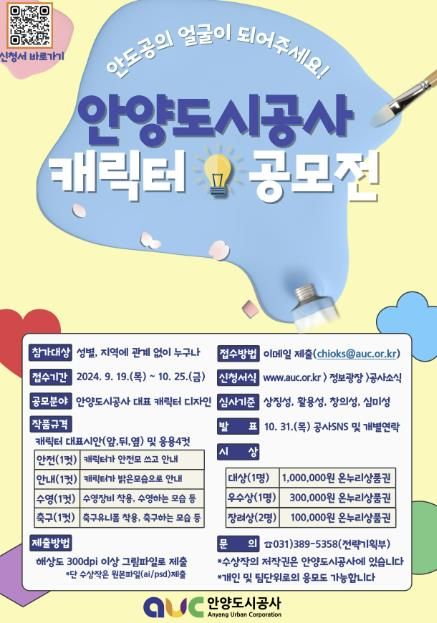 당선작품 대상 1명에게 온누리상품권 100 만 원, 우수상 1명에게 30만 원, 장려상 2명에게는 각 10만 원을 수여한다. 신청 방법은 안양도시공사 누리집‘공사 소식’게시판의 지원서를 내려받아 작성 후 그림파일과 함께 이메일로 제출하면 된다.