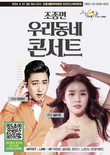 조종면 생활체육공원에서 열리는 ‘우리동네콘서트’는 트로트계의 스타인 박현빈과 설하윤이 출연해 조종면민의 눈과 귀를 즐겁게 해줄 예정이다. 공연은 군민들은 무료로, 타지역 주민은 가평군 내에서 소비한 1만원 이상의 영수증을 지참 시 무료 입장이 가능하다.