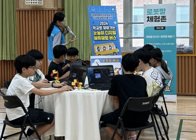 [눈높이 디지털 에듀체험버스]는 학교로 직접 찾아가 디지털 체험 존(ZONE)을 설치하여 학생 눈높이에 맞춘 디지털 기기 체험 및 디지털 문해력 교육을 실시하는 교육 프로그램이다. 드론 시뮬레이션 체험, 핑퐁로봇을 이용한 축구로봇체험, 인공지능(AI) 로봇팔을 활용한 미래기술 체험 등 6가지 부스체험을 통해 학생들이 성숙한 디지털 시민으로 성장 할 수 있도록 지원한다.