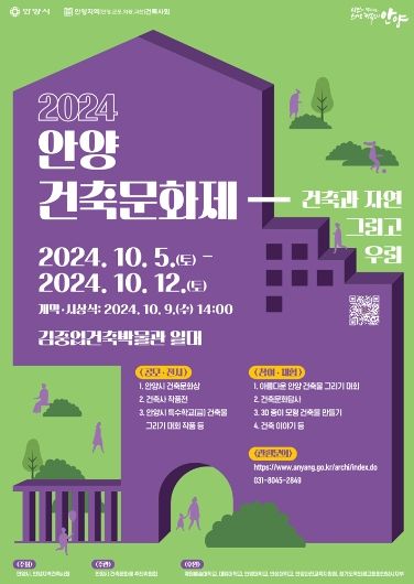 또 9일 오후 1시부터 5시까지 유치원생・초등학생이 참여하는 ‘아름다운 안양 그리기 대회’가 열릴 예정으로 현재 안양건축문화제 공식 홈페이지에서 사전 접수가 진행 중이며, 현장 접수도 가능하다.