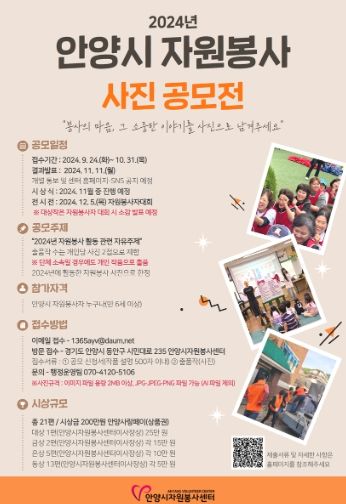 (중부시사신문) 안양시자원봉사센터는 오는 10월 31일까지 2024년 자원봉사 사진 공모전을 개최한다고 25일 밝혔다.