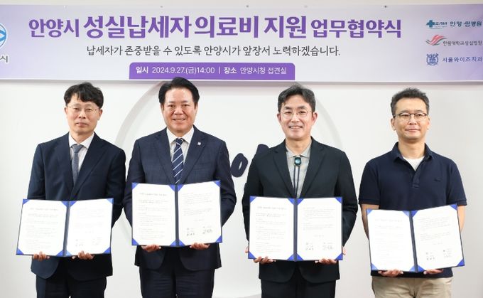 시는 27일 오후 2시 시청 3층 접견실에서 권덕주 안양샘병원 병원장, 김형수 한림대성심병원 병원장, 김용희 서울와이즈치과의원 원장 등이 참석이 참석한 가운데 ‘성실납세자 의료비 지원 업무 협약식’을 열었다.