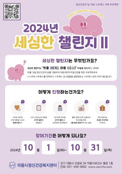임인동 의왕시보건소장은 “삶의 면역력과 평온함을 위해서는 스트레스 관리가 중요하다”며 “세심한 챌린지Ⅱ에 적극 참여하셔서 일상 속에서 정신 건강 관리를 실천하길 바란다”고 말했다.