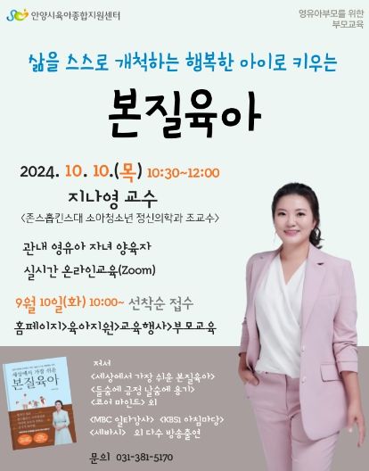 (중부시사신문) 안양시는 오는 10일 오전 10시 30부터 12시까지 영유아 자녀를 둔 양육자를 대상으로 지나영 교수의 ‘본질육아’ 온라인 부모교육을 진행하고 교육생을 모집 중이라고 4일 밝혔다.