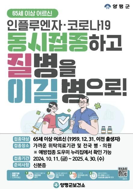 (중부시사신문) 양평군은 11일부터 65세 이상 어르신을 대상으로 지정 의료기관에서 독감(인플루엔자)·코로나19 예방 접종을 무료로 실시한다고 밝혔다.