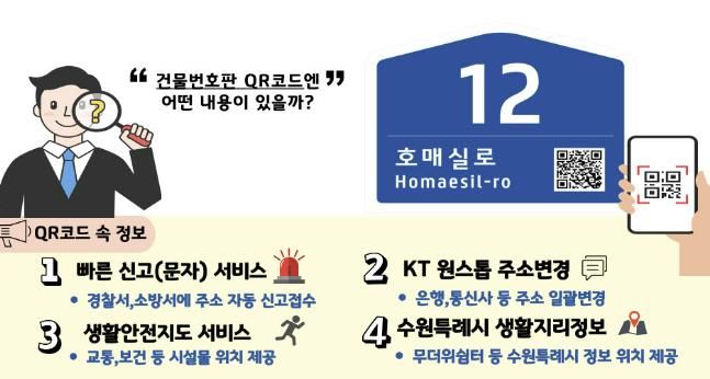 권선구 건물번호판 QR코드에는 ① 음성안내서비스, ② 빠른신고(문자)서비스, ➂ 위치정보 부가서비스(카카오맵 연동), ➃ KT 무료 주소 일괄변경, ⑤ 생활안전지도, ⑥ 수원시 생활지리정보 등이 바로 연결될 수 있도록 설정되어 있다.