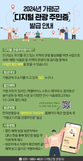 군 관계자는 “가평을 방문하는 관광객들이 더욱 다양한 혜택을 받을 수 있도록 디지털 관광주민증을 적극 홍보하고, 할인 혜택 제공 업체를 지속적으로 늘려나갈 계획”이라고 밝혔다.
