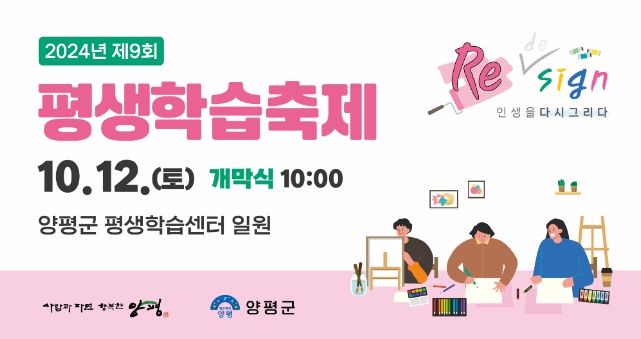 올해 9회째를 맞이하는 양평군 평생학습축제는 ‘Re design(인생을 다시그리다)’을 주제로 평생학습기관, 동아리, 그 외 유관 기관과 함께 남녀노소는 물론 전 세대가 다양한 평생학습 프로그램을 체험하고 인생을 다시 그릴 수 있는 영감을 얻을 수 있도록 공연과 체험, 전시 행사 등을 운영한다.