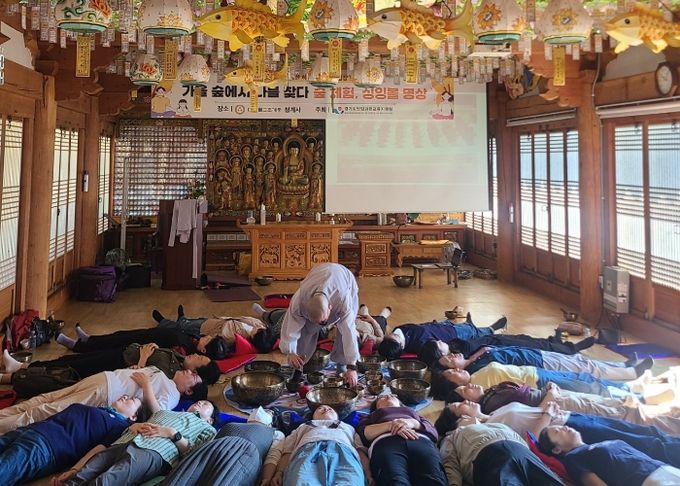 특히 10월 12일 청계사에서 진행된‘가을 숲에서 나를 찾다, 숲 테라피’에서는 참가 교사들이 힐링 숲 체험, 싱잉볼 명상을 통해 직무 스트레스를 해소하고 재충전하는 시간을 가졌다.
