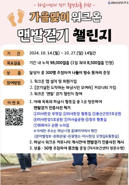 한편, 하남시보건소는 K-어싱 축제에 맞춰 이달 14일부터 27일까지 ‘가을맞이 맨발걷기’ 워크온 챌린지를 진행한다. 14일간 누계 98,000걸음(1일 최대 8,500걸음)을 달성한 300명을 추첨하여 소정의 상품을 제공하고, 미사한강모랫길 등 하남시 맨발걷기 장소에서 맨발걷기를 하는 모습을 사진으로 인증하는 이벤트도 실시할 예정이다.