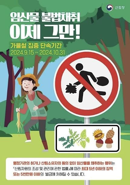 한편, 단속기간 중 불법 임산물 채취가 적발될 경우 '산림자원의 조성 및 관리에 관한 법률'에 따라 최대 5년 이하의 징역 또는 5,000만원 이하 벌금형을 받을 수 있다.