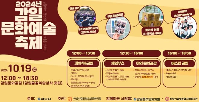 (중부시사신문) 하남시가 주최하고 감일청소년문화의집이 주관하는 ‘제1회 감일문화예술축제’가 오는 19일 감일문화공원에서 개최된다.