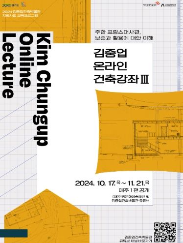 이번 강좌에서는 ‘주한 프랑스대사관, 보존과 활용에 대한 이해’를 주제로 총 6편의 영상이 공개될 예정이다. ▲17일 정재은 김중업건축박물관 학예팀장의 주한 프랑스대사관 기증유물 기획展 '어느 건축가의 흔적' 기획 과정 ▲24일 조민석 매스스터디스 대표의 맥락, 움직이는 과녁 ▲31일 배정순 이안알앤씨 소장의 주한 프랑스대사관 신축 및 리모델링 공사가 공개된다.