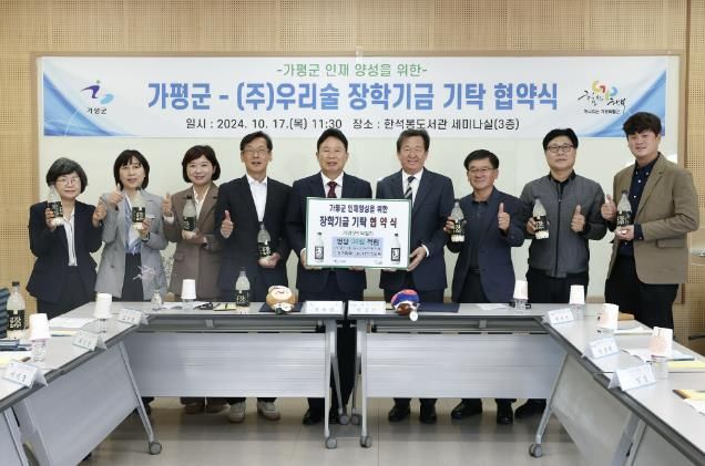 가평군은 17일 한석봉도서관에서 ㈜우리술과 잣막걸리 한 병당 30원의 장학기금 적립을 주내용으로 하는 장학기금 기탁 협약을 체결했다. ㈜우리술은 가평군 조종면에 본사와 막걸리 생산시설을 갖춘 지역기업이다. 이날 협약식에는 서태원 군수와 박성기 ㈜우리술 대표를 비롯한 관계자 10여명이 참석했다.