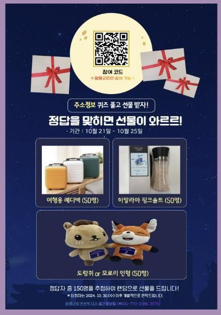 정답자 중 150명을 추첨해 여행용 가방, 핑크솔트, 도람쥐와 모로리(도로명주소 홍보 캐릭터) 인형 등의 선물을 제공한다.