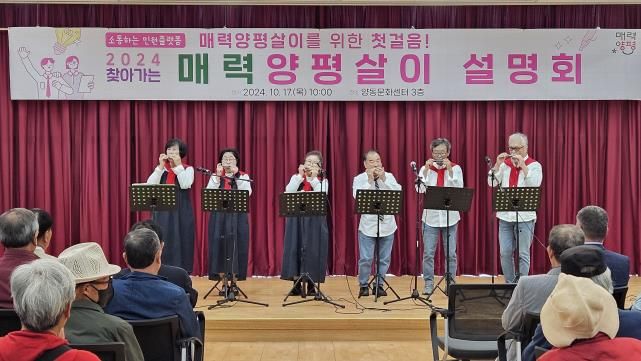 양동면 주민자치센터 수강생으로 이루어진 하모니카 연주팀 ‘룰루랄라 하모니카 앙상블’의 공연으로 시작한 설명회는 양평군과 양동면의 역사·문화 및 인물에 대한 교양강의와 양평살이에 필요한 생활정보를 엮은 양평살이 안내서 설명 순으로 진행됐다.