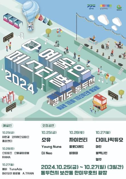 ▲(공연) ‘2024 기회소득 예술인 페스티벌 × 헬로 DDC 페스티벌’이 오는 10월 25일부터 27일까지 총 3일간 동두천시 보산동 관광특구 일대에서 개최된다. 이번 공연은 경기도와 동두천시, 경기문화재단이 함께 개최하였으며, 다양한 분야와 지역에서 활동하고 있는 경기도 기회소득 예술인 총 10팀과 앰비규어스댄스컴퍼니 및 소유, 자이언티, 비와이, 다이나믹 듀오 등 국내 최정상 아티스트들의 다양한 초청공연이 펼쳐진다.